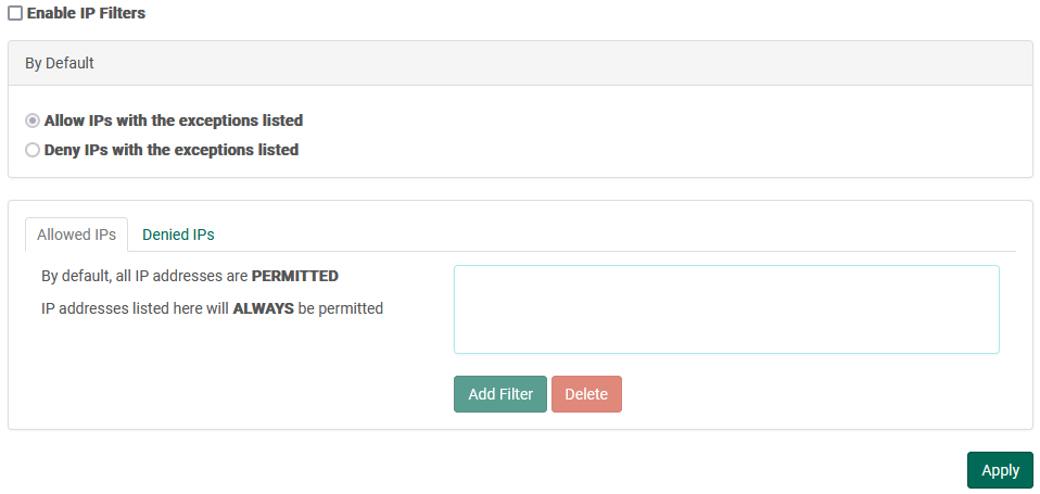 IP Filters provide a method of protecting your server from attacks or malicious users. Servers can be pre configured to allow or deny all IPs by default, and then provide exceptions to the default rules. If Allow is enabled, any IP's on the allow list will take precedence over the Denied list. If Deny is enabled, items in the deny list take precedence over the allow list. There are separate IP filter lists for users and administrators.